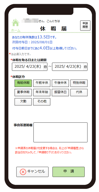 【休暇届】思いたったらスマホからいつでも申請。有給休暇の残日数って何日だっけ?も申請画面からすぐに確認できます。