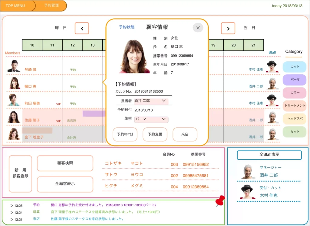 予約状況は施術ごとに色わけされ、かわりやすく!