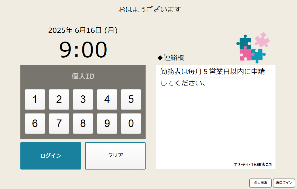 自分の打刻記録を確認する場合は、個人画面から「ID」「パスワード」でログインします。