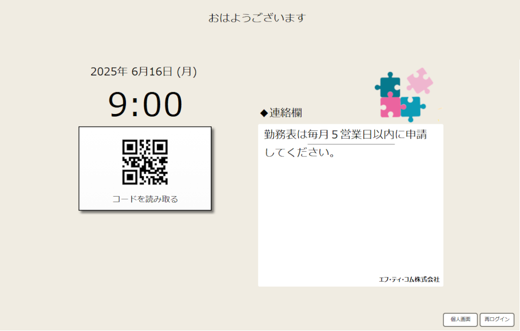 従業員が「出勤」「退勤」ボタンを押すと時刻が記録されます。