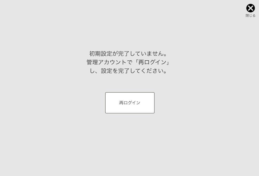 「初期設定が完了していません….」という画面が表示されるので、「再ログイン」をタップして下記管理アカウントとパスワードで再ログインしなおしてください。